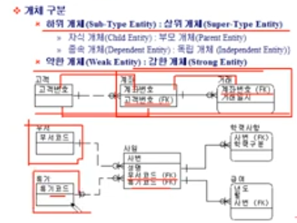 하위 Entity : FK 를 갖고있는 Entity (=다른 Entity의 PK 를 FK 로 가지고 있는 경우). 위 예제에서 '계좌 Entity', '사원 Entity'