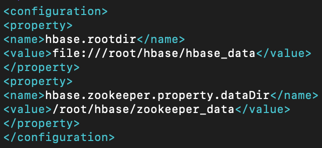 <configuration> <property> <name>hbase.rootdir</name> <value>file:///root/hbase/hbase_data</value> </property>
