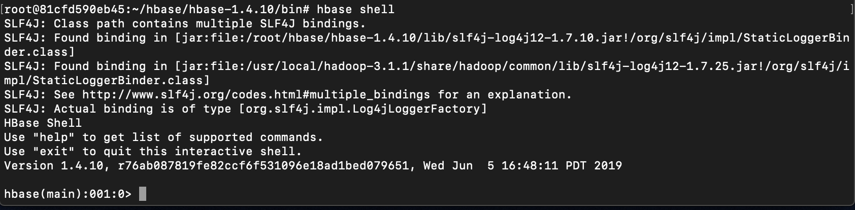 /bin 에서 hbase shell 명령어를 통해 shell 에 접속해본다.