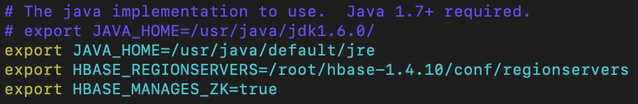 hbase-env.sh 를 열어서 아래와 같이 export 를 넣어준다.
