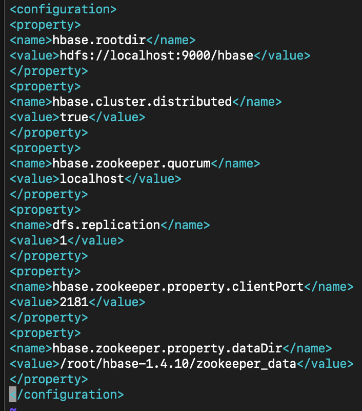 <property> <name>hbase.rootdir</name> <value>hdfs://localhost:9000/hbase</value> </property> <property> <name>hbase.cluster.distributed</name> <value>true</value> </property> <property> <name>hbase.zookeeper.quorum</name> <value>localhost</value> </property> <property> <name>dfs.replication</name> <value>1</value> </property> <property> <name>hbase.zookeeper.property.clientPort</name> <value>2181</value> </property>