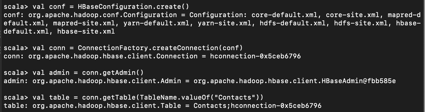 val conf = HBaseConfiguration.create() val conn = ConnectionFactory.createConnection(conf) val admin = conn.getAdmin() //여기 예제에서는 admin 은 사용하지 않지만, "이렇게 admin 을 얻는다" 고 참고 삼아 넣어둠. val table = conn.getTable(TableName.valueOf("Contacts"))