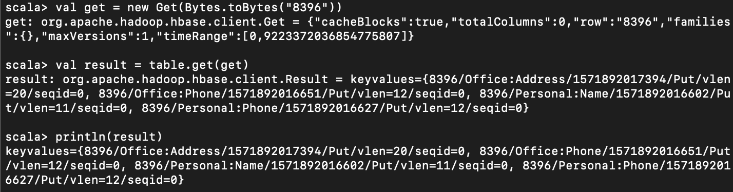 //Get example. row key 가 8396 인 것만 가져온다. val get = new Get(Bytes.toBytes("8396")) val result = table.get(get) println(result)