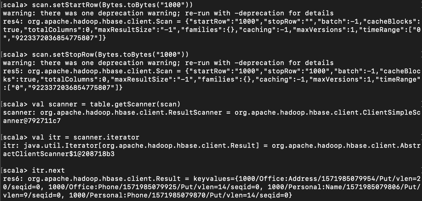 //Scan example. Contacts 테이블의 모든 row 를 Scan 하여 iterator 로 뽑아온다. val scan = table.getScanner(new Scan()) val itr = scan.iterator println(itr.next)