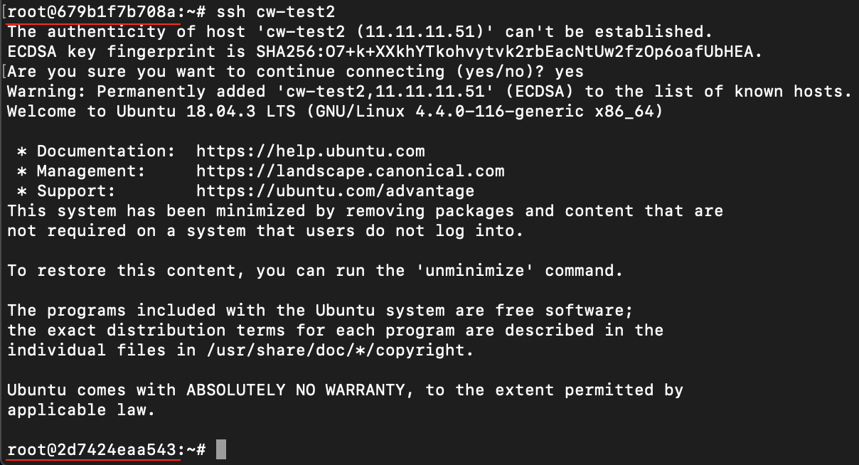 sudo docker exec -it cw-test1 bash ssh cw-test2 //Are you sure you want to continue connecting (yes/no)? 라고 물으면 yes 를 타이핑