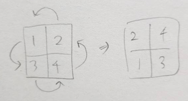 key idea : 생각해보면 아래 그림과 같이, 동일한 조건에 의해 좌표가 이동한다. 단순히 각 좌표 각각에 알맞는 값만큼 좌표값을 바꿔주기만 하면 된다. ![]() 크기가 커져도 똑같이 적용된다. 문제는 추가적인 buffer 를 사용하지 못하기 때문에 다른 곳에 옮길 수 없어서, 문제를 해당 matrix 내에서 해결해야 한다는 점이다. 일반적인 swap method 로 (위의 그림에서) 1과 3을 바꿨다고 하자. 그럼 3과 4를 바꿀 때는 어떻게 할까? swap 절차를 늘리면 된다. 이를 테면 temp = one one = two two = four four = three three = temp 이런식으로. 나에겐 참으로 무릎을 딱 치게 만든 기막힌 발상이었다.