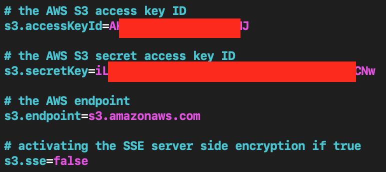 그곳에 s3 access key id, s3 secret key, s3 endpoint 를 넣는 곳이 있는데 아래 이미지처럼 자신의 access key id 와 secret key 를 넣는다.