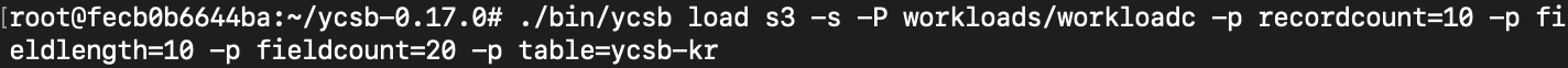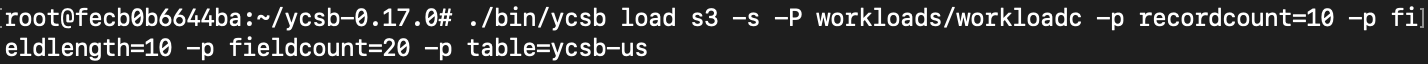 ./bin/ycsb load s3 -s -P workloads/workloadc -p recordcount=10 -p fieldlength=10 -p fieldcount=20 -p table=ycsb-us