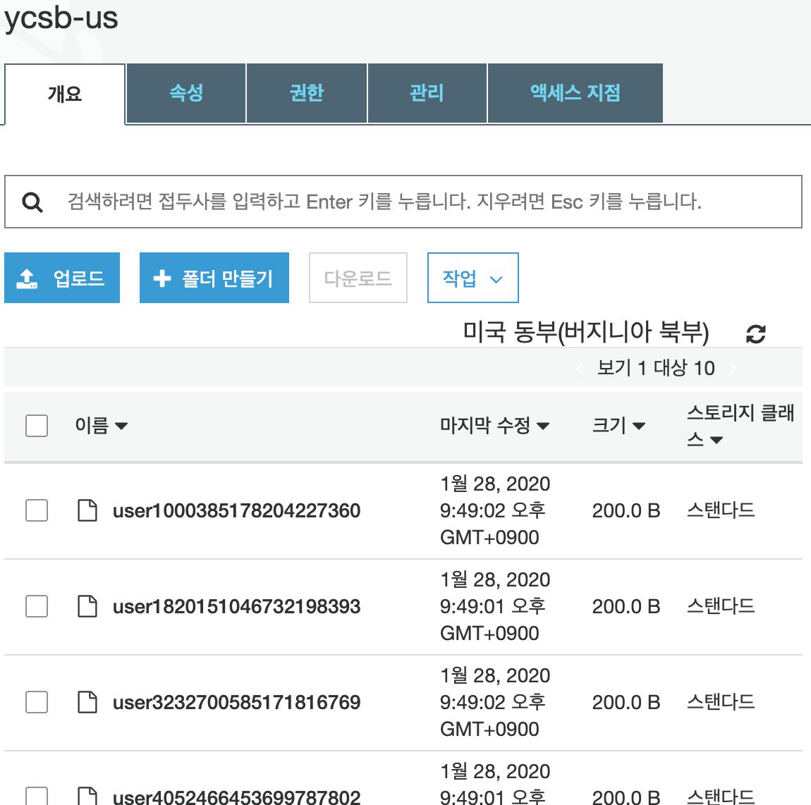 -p table를 ycsb-test 로 두어 버지니아에 있는 ycsb-us 라는 이름의 bucket 에 데이터를 넣음을 명시하였다.