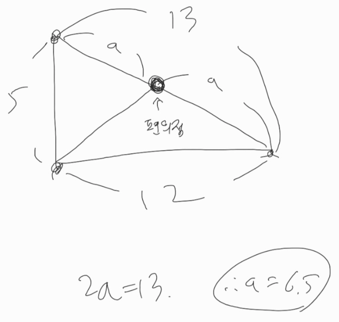 동섭의 집에서 동쪽으로 12km 가면 효석의 집이 있고, 북쪽으로 곧장 5km 가면 선아의 집이 있다. 이처럼 세 집이 직각삼각형의 형태를 띠고 있을 때, 세 집으로부터 같은 거리에 있는 지점에 편의점이 들어왔다고 할 때, 각 집에서 편의점까지의 거리는 얼마인가.