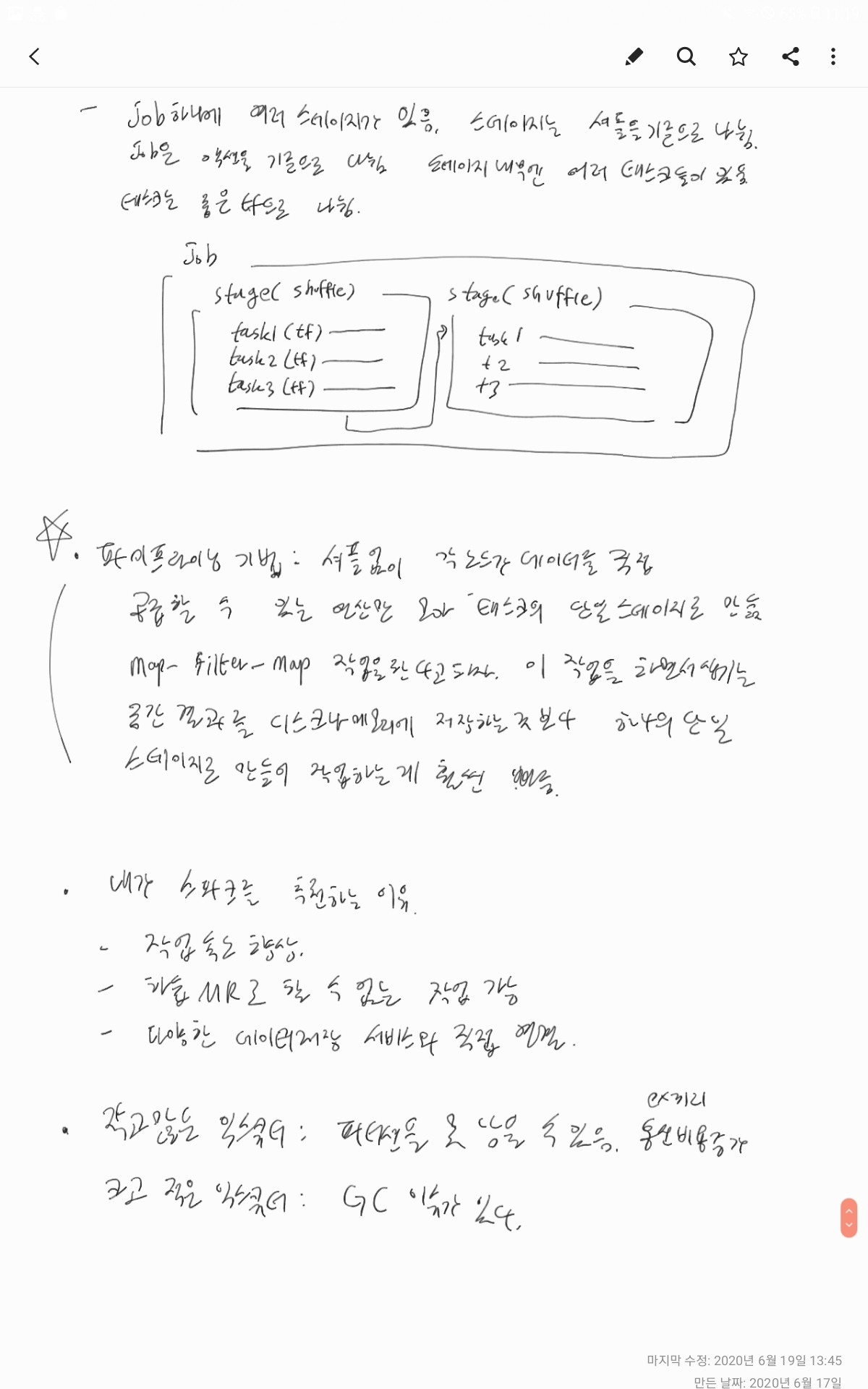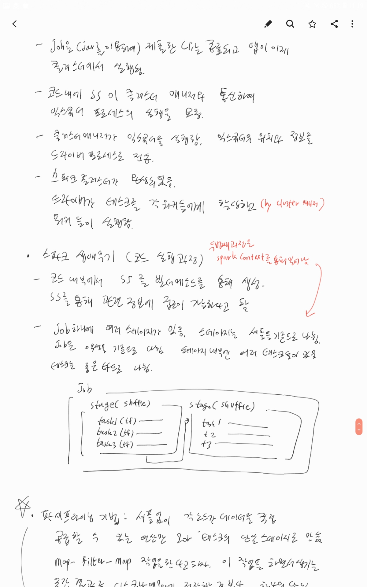 스파크 애플리케이션 실행 과정 (내부) - 빌더 메소드를 통해 런타임에 SparkSession 생성 (빌더 메소드를 사용하여, 여러 라이브러리에서 SparkSession 다수 생성하는 상황 방지) - SparkSession 생성 후 스파크 코드 실행 가능 SparkSession 을 통해 sparksql, 고/저수준 API 실행, 기존 spark context, 관련 설정 정보 등에 접근 가능 - 코드에서 action 이 실행되면 스테이지와 태스크로 이루어진 job 이 실행됨 액션 하나 = spark job 하나 - 스테이지 : 다수의 머신에서 동일한 연산을 수행하는 태스크 그룹 좁은 트랜스포메이션으로 실행 가능한 태스크들을 하나로 뭉친 것(파이프라이닝)이 스테이지 셔플(넓은 트랜스포메이션)이 진행되면 무조건 새로운 스테이지가 시작됨 스테이지가 마무리된다?(=모든 머신 위의 태스크들이 작업을 마친다) -> 한 스테이지가 마무리 된 이후에 새로운 스테이지가 시작된다(=새로운 태스크들이 각 머신에서 병렬로 시작되어 작업 수행한다) - 태스크 : 단일 익스큐터에서 실행할 데이터의 블록과, 다수의 좁은 트랜스포메이션 조합 태스크는 파티션 개수대로 생성 (=하나의 파티션은 하나의 태스크에서 처리됨) 따라서 파티션 개수가 많아지면 병렬 처리성이 올라감 - 셔플 실행시, 다른 노드로부터 넘겨받은 데이터(셔플 결과)는 local disk 에 쓰여짐 job 이 실패할 경우, local disk 에 쓰여진 데이터에서부터 다시 진행 가능 (spark webui 에서 skipped 라고 표시된 게 바로 이것) (재셔플이 필수인 상황에서는 부작용으로 보이지만, 대부분의 상황에서는 시간 절약해주는 기능) 스파크에서 '파이프라이닝'기법이란, 노드 간 데이터 이동 없이 각 노드가 데이터를 직접 처리할 수 있는 연산만 모아 단일 스테이지로 만드는 실행하는 것 예를 들어 map, filter, map 순서로 작업을 수행하도록 만들었다면 내부적으로 각 작업들을 task 로 만들고 하나의 스테이지 에서 수행되도록 함 이렇게 하면, 각 단계별로 memory나 disk 에 중간 결과를 저장하지 않고 빠르게 처리할 수 있음 (셔플이 필요한 연산(넓은 트랜스포메이션)은 단일 머신에서 파이프라이닝을 할 수 없음) |