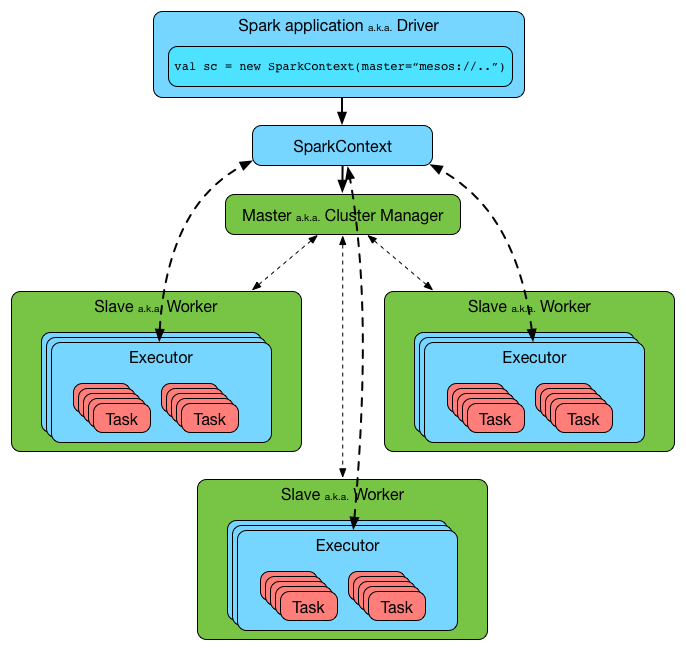 - 스파크의 모든 executor는 JVM (자바 가상 머신)을 하나 실행한 후 그 위에서 실행된다.