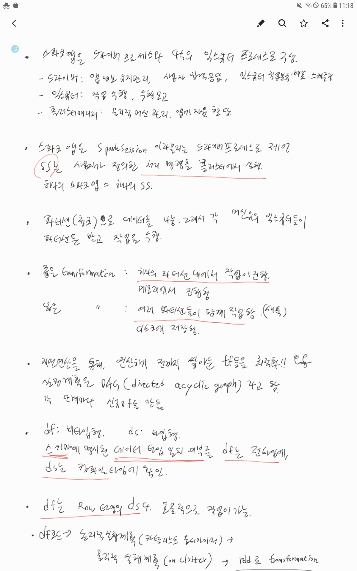 지연 연산 : action 이 일어나기 전까지 연산을 기다리는 동작 왜 기다릴까? action 이 일어나기 전 모든 연산을 최적화하기 위해서. 조건절 푸시다운 : 조건을 데이터 소스에 위임 예를 들어, RDB 에서 전체 데이터를 읽고 하나의 로우만 갖고 오는 작업 진행시, 스파크는 하나의 로우만 갖고오도록 RDB 에 where 조건 처리를 위임하여 RDB 에서 하나의 로우만 갖고옴 액션 - 일련의 트랜스포메이션으로부터 결과를 계산하는 명령어 - count, show 등 - 액션이 일어나면 spark job 이 실행됨 |
