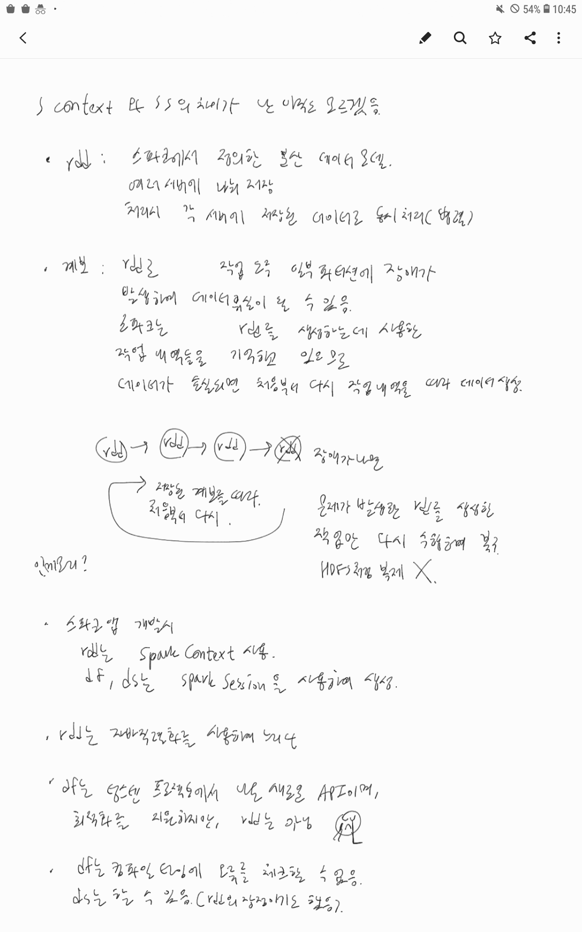 sparksession 이란, 데이터를 처리하는 진입점(Entry Point) 역할을 하는 객체 드라이버 프로세스 그 자체임. 하나의 spark session 이 생성되었다? -> 하나의 스파크 앱이 실행되었다고 보면 됨 sparksession 은 사용자가 작성한 Spark 코드를 해석하고 실행 계획(DAG)을 생성함 - 코드를 해석하여 논리적 실행 계획 및 물리적 실행 계획 생성 - 물리적 실행 계획이 (DAG scheduler 에 의해) stage 단위로 나뉨 - 각 stage 가 여러 task 로 나뉘고 각 executor 에 전달됨 - 각 executor 가 task 를 받아 병렬 처리함 sparksession 을 통해 df, ds, rdd, sparksql 를 처리할 수 있음 (DataFrame, Dataset, SQL API 를 처리할 수 있음) - 여기서 말하는 '처리'란, df, ds, rdd, sparksql 코드를 해석하고 실행 계획을 수립한다는 의미 sparksession 은 클러스터 매니저에게 작업을 위한 자원(executor 개수, memory 크기 등)을 요청하고 받아, 작업 실행에 사용함 - yarn 이 사용 가능한 노드에 container 를 생성하고 spark 에게 사용하라고 넘겨줌 - 이 container 에서 새로운 spark executor 가 실행됨 - sparksession 에서 dag(stage) 의 task를 새로운 executor 에게 할당 sparksession 을 통해 csv, json 등 다양한 포맷의 파일을 읽음 - '파일을 읽는다'는 의미도, 파일 읽고 코드를 해석하고 실행 계획을 수립한다는 의미임. 실질적인 읽기 작업은 각 executor 에서 진행됨 sparkcontext 는 1.0 버전에서 주로 사용되었고, 2.0 이상 버전에서는 sparksession 에 흡수됨 sparkcontext 는 rdd 를 생성하고 관리할 때 필요함. (rdd API 를 처리할 수 있음) 2.0 이상 버전부터는 sparkcontext 대신 sparksession 을 주로 사용함 |