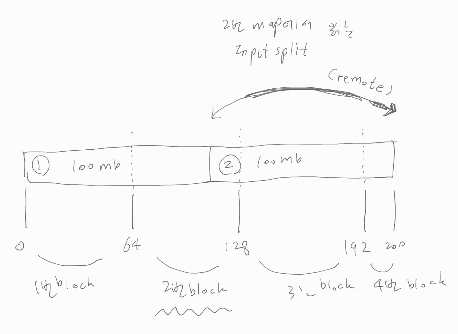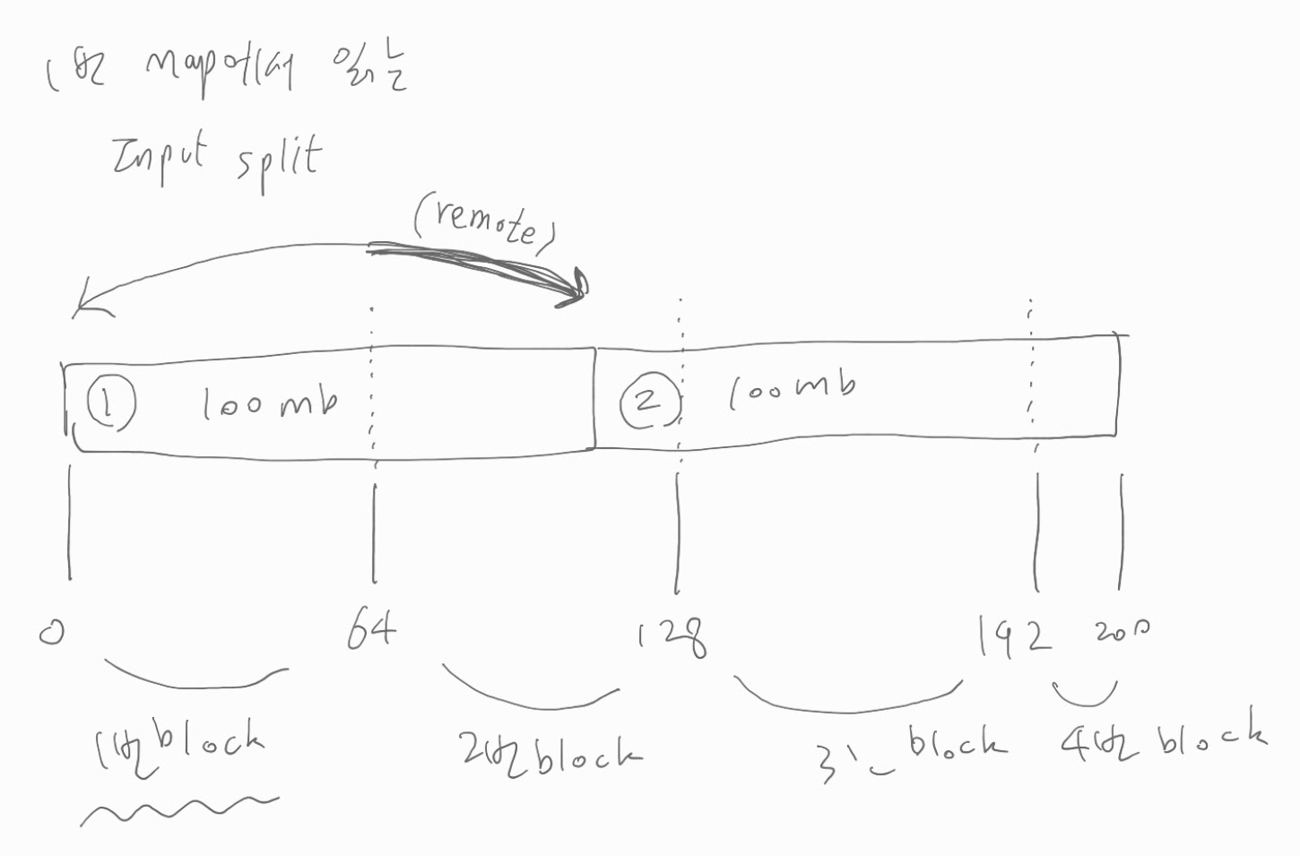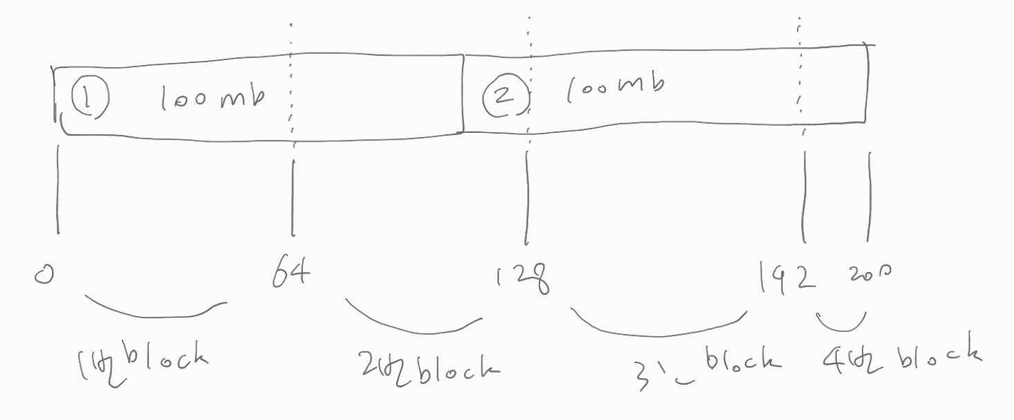 이 file 을 대상으로 MR 을 시도할 때 Map은 (크기를 바꾸지 않았다면) block size 만큼의 input split 데이터를 읽을 것이다.