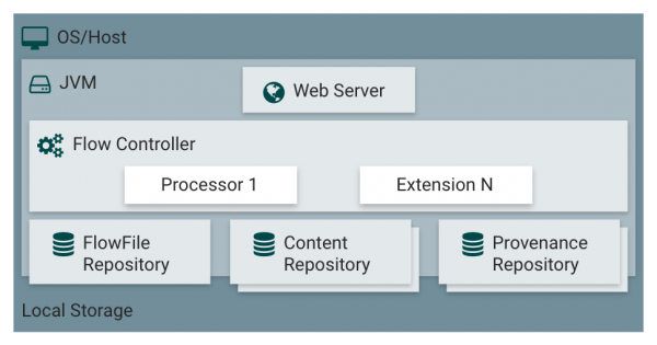 | Nifi 는 JVM 위에서 실행됨. 다음과 같이, JVM 위에 Web Server, Flow Controller, Repositories 가 있음(물론 repo 는 disk 에 있음). Flow Controller : 작업 thread 제공, 리소스 스케줄링 관리 FlowFile Repo : 현재 flow 에서 활성화 된 FlowFile 의 상태를 저장하는 곳(ff 의 메타데이터 인 듯) 디스크에 저장되며 영구 Write-Ahead Log 임. Content Repo : FlowFile 의 실제 데이터를 저장하는 곳. filesystem 에 데이터 블록을 저장하는 방식. 단일 스토리지 뿐 아니라, 여러 스토리지에 저장할 수 있음. Provenance Repo : 모든 출처 이벤트 데이터를 저장하는 곳. 이를테면 어떤 데이터가 A Processor 에서 나왔는지, B Processor 가 어떤 flow 를 타고 진행되었는지 등. 하나 이상의 스토리지에 저장 가능 이 repo 내의 데이터는 indexing 되어있어 검색이 가능함. nifi.apache.org/docs/nifi-docs/html/overview.html#nifi-architecture |