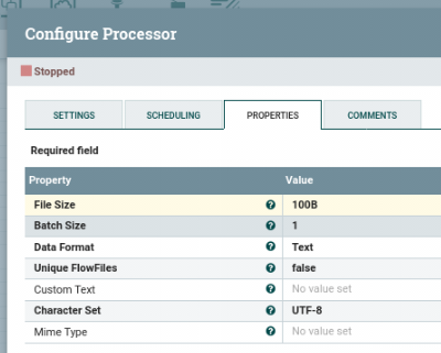 | FileSize : GenerateFile 에서 생성한 FF의 총 크기 Batch : GenerateFile 에서 생성한 후 Connector 로 내보내는 FF 의 수 Concurrent tasks : GenerateFile 에서 동시에 스케줄되는 task 의 수. 바로 아래 예제에서는 4 대의 노드에서 동시에 32개의 쓰레드를 실행하기 때문에, 결과적으로 32x4 = 128, 총 128개의 쓰레드가 GenerateFile Processor 를 위해 동작 세팅 방법 : 해당 Processor 의 config 에서 세팅 |