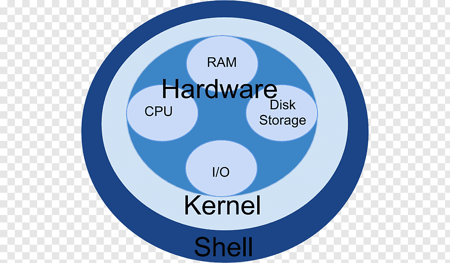 하드웨어 위에 커널이 있고, 커널 위에는 명령어 해석기인 셸(bash, csh 등) 이 있다.