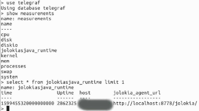 아래 이미지는, influxDB 안에 jolokia 로부터 온 jvm 데이터가 telegraf 에 의해 저장되어있는 모습을 보여줌