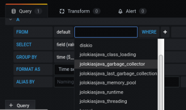 panel 을 생성 및 query 를 작성하는 부분에서 jvm 의 데이터 table 을 볼 수 있다.