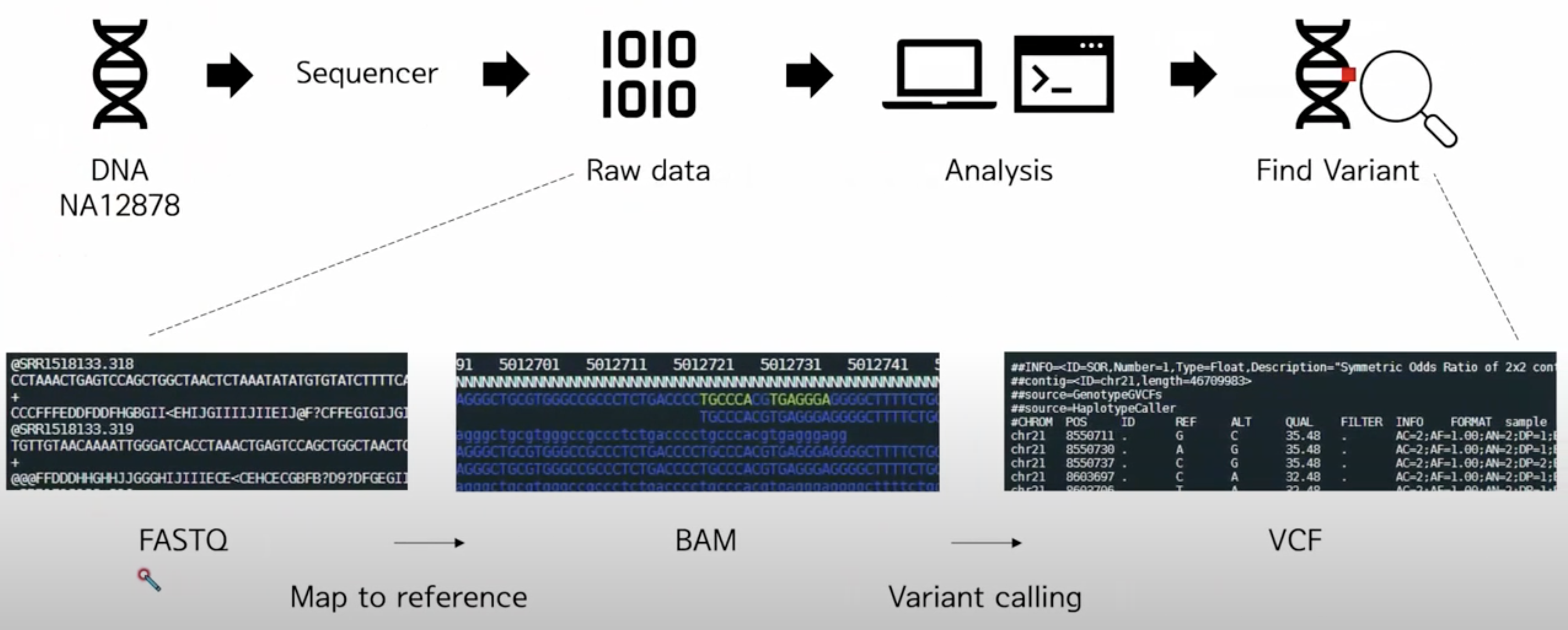 샘플에서 DNA를 추출하고 DNA를 무작위로 자른 후 sequencer가 읽을 수 있도록 library를 제작합니다. 이후 이를 sequencer에 넣고 DNA 서열을 읽어서 A, C, G, T의 서열이 나오게 됩니다. Sequencer가 library를 한 번 읽는 단위를 리드(read)라고 합니다. Sequencing을 진행하게 되면 필연적으로 PCR (Polymerase Chain Reaction) 과정에 의해 중복 리드가 발생합니다. 이러한 중복 리드들은 variant calling 과정에서 영향을 주게 됩니다. 그래서 duplication을 마킹하여 variant calling 때 영향을 주지 않도록 만들어야 합니다. 한 샘플을 Sequencer에서 서열을 읽게 되면 수백만개의 리드가 나오게 되고 리드와 오류값으로 구성된 파일을 FASTQ 파일이라고 합니다. FASTQ는 네 줄이 하나의 리드로 구성됩니다. 첫 번째 줄은 헤더, 두 번째 줄은 서열, 세 번째 줄은 구분자(+), 네 번째 줄은 각 서열에 대한 퀄리티(오류치) 줄입니다. 예를 들어 @SRR1518133.318 CCTAAACTGAGTCCAGCTGGCTAACTCTAAATATATGTGTATCTTTTCAGCATAAAAAAAATAATGTTTTTCATAA + CCCFFFEDDFDDFHGBGII<EHIJGIIIIJIIEIJ@F?CFFEGIGIJGIEDEGIE@HGIHDCG@CEHEEHFBCFED 이렇게 나온 FASTQ 파일을 reference sequence, 즉 기준이 되는 서열에 mapping을 합니다. 이렇게 mapping이 된 파일을 SAM, BAM 파일이라고 합니다. BAM 파일에서 기준 서열과 다른 서열을 찾아낼 수 있는데, 이를 변이를 찾아내는 과정, 즉 variant calling 이라고 합니다. |