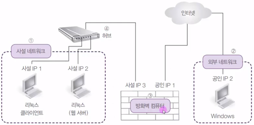 사설 네트워크를 사용하는 모든 컴퓨터들은 외부로 나가기 위해서는 방화벽 컴퓨터를 거침
