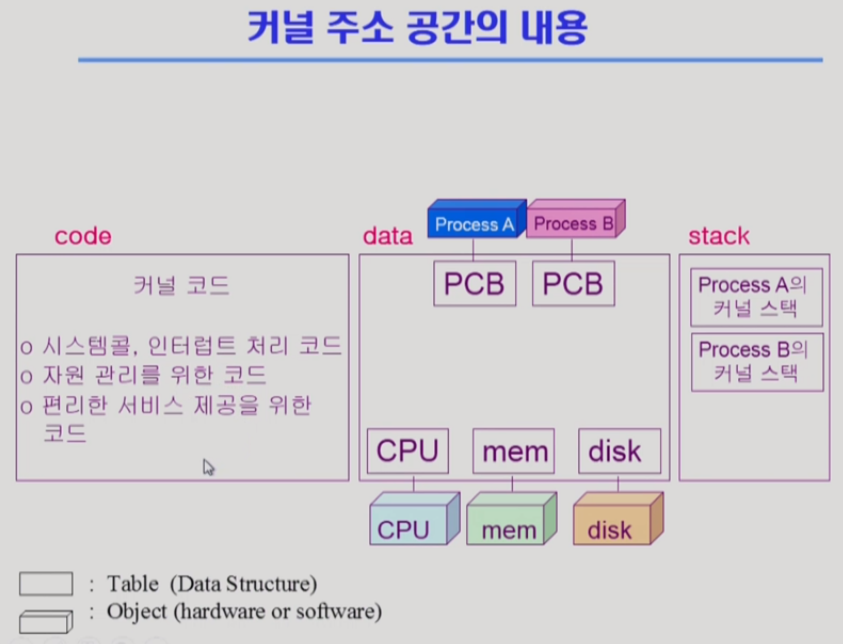 - 커널 역시 프로그램(상시 돌아가는 process)이기 때문에 자신의 메모리 주소 공간을 갖고 있음