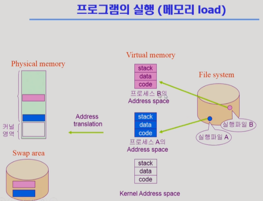- 즉, disk 에서 프로그램이 실행을 위해 필요한 부분만 읽어 메모리에 넣은 다음 cpu 를 통해 실행시키는 것.