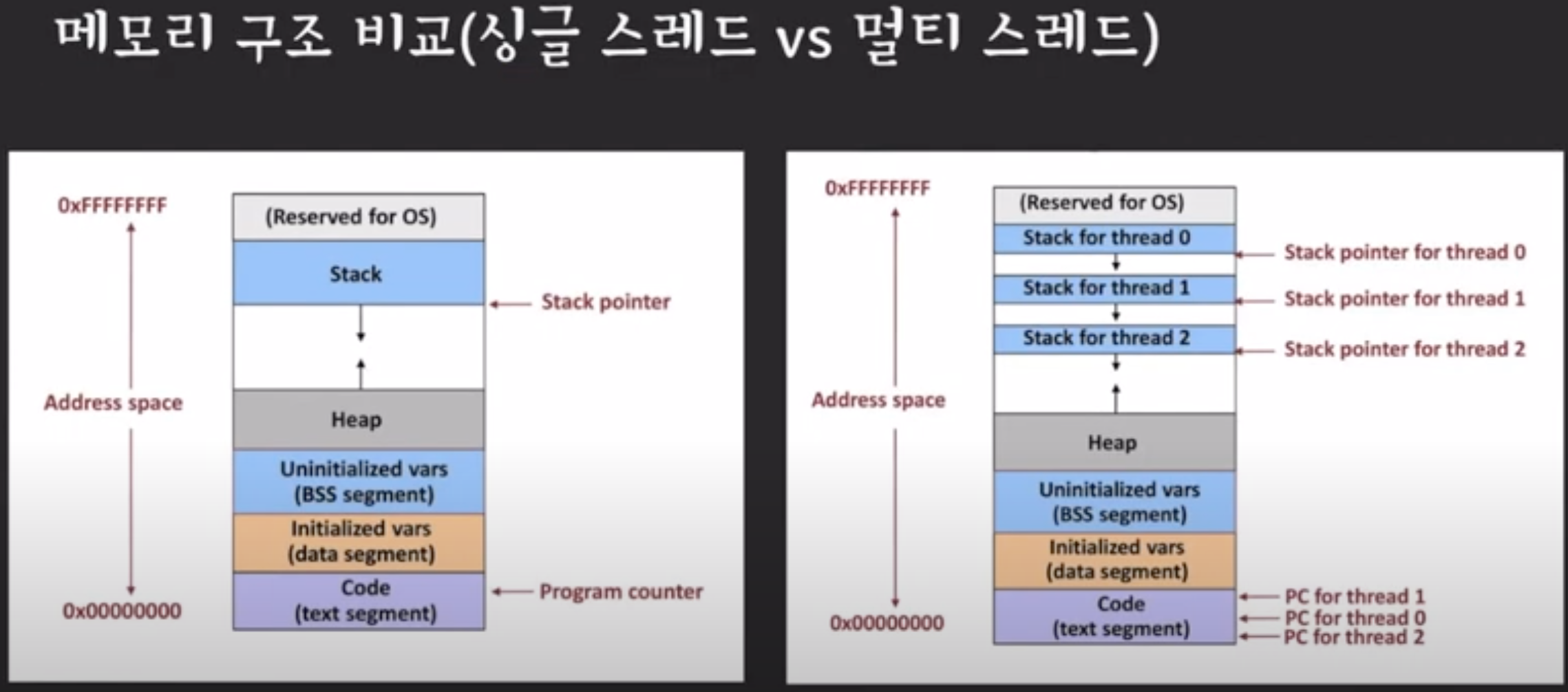 결과적으로 thread (독립적으로) 각자가 갖고 있는 값은 pc, 레지스터, stack 공간임