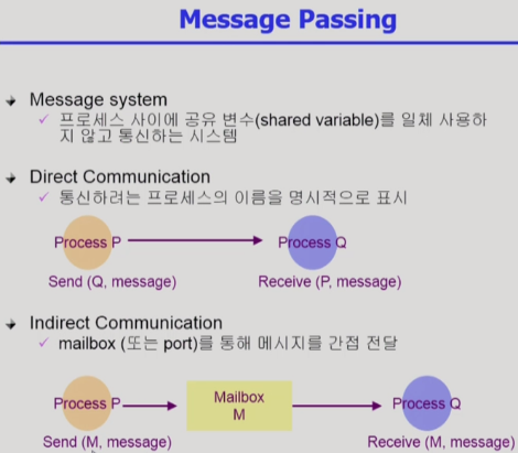 message passing : 프로세스 끼리 메세지를 주고받으면서 서로 영향을 끼치는 것.