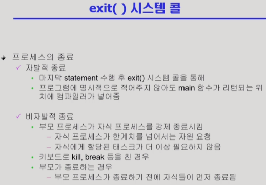 ㄴ자식이 직접 자기 자신을 죽임(대개 program 의 마지막에 호출. main 함수가 return 될 때 자동으로 exit 가 붙음)