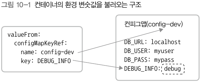 컨피그맵을 컨테이너와 분리하면 컨테이너 하나를 개발용, 사용 전 테스트용, 상용 서비스용으로 사용 가능