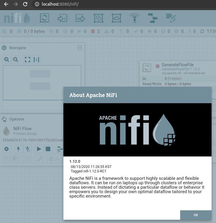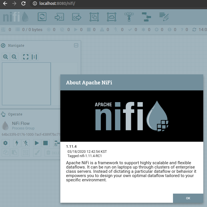 localhost:8080 으로 접속하여 NiFi 가 잘 구동되는지 확인한다.
