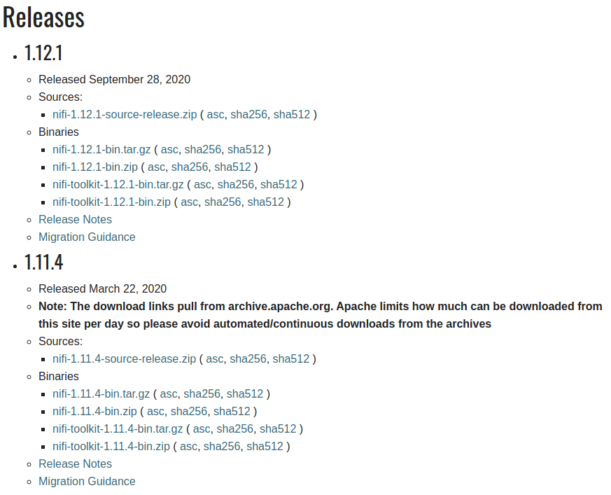 현재 날짜 (2020.12.15) 기준으로 nifi 공식 홈페이지에서 받을 수 있는 Releases 된 버전은 두가지