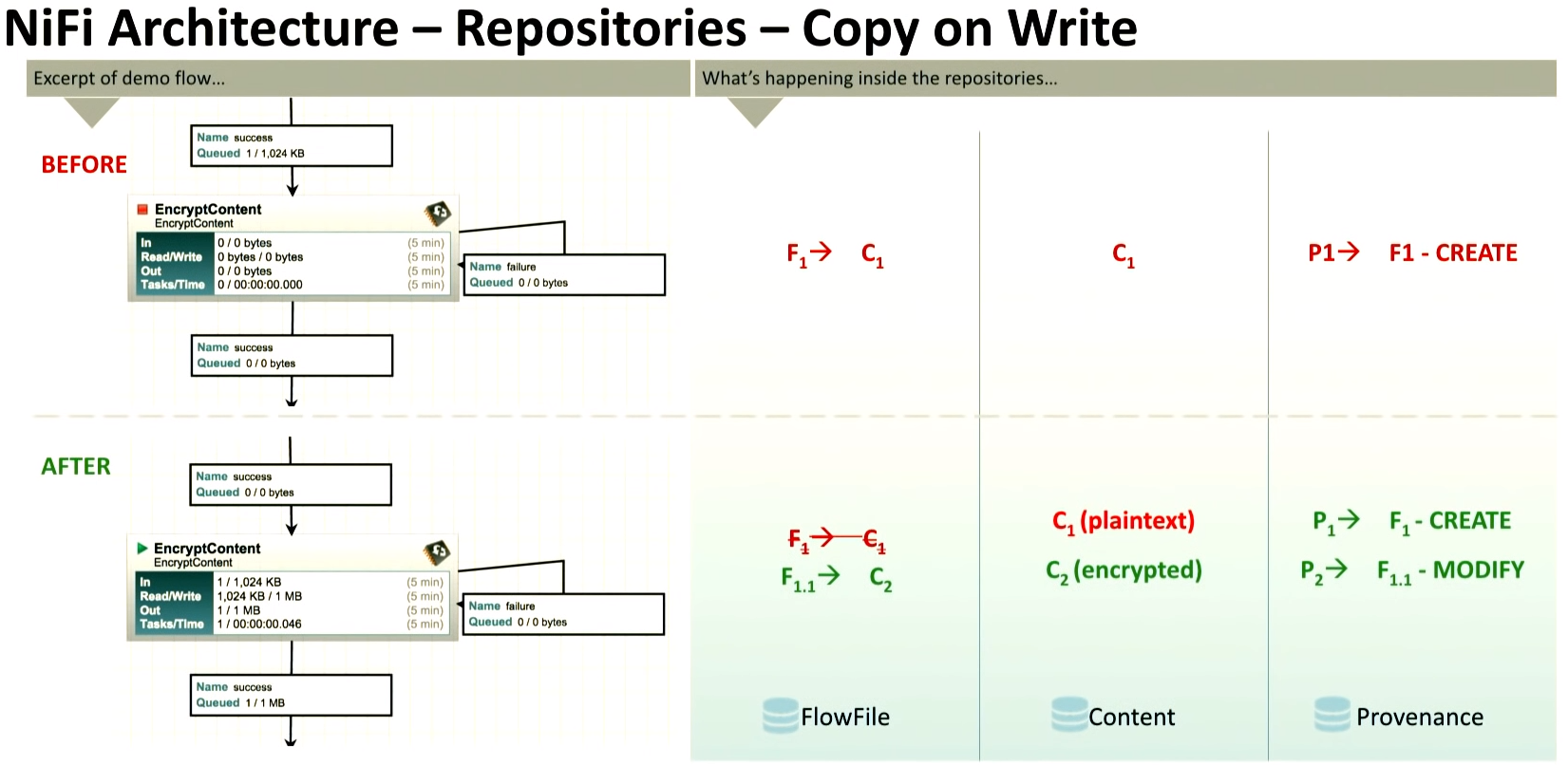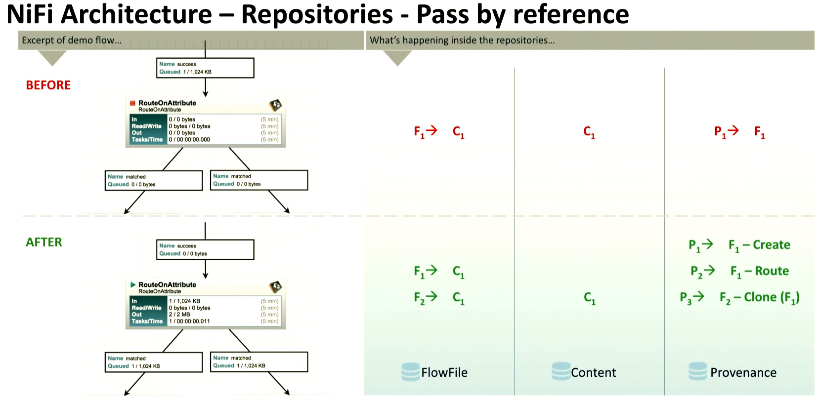 | <Before> - FlowFile Repo : 존재하는 하나의 FlowFile 의 내용(C1)을 포인팅하는 F1 을 담고 있음 - Content Repo : 존재하는 하나의 FlowFile 의 내용 C1 을 담고 있음 - Provenance Repo : F1의 정보를 담고 있음. |