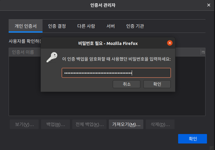 인증서 보기(C) 를 누른 후, 개인 인증서 탭에서 가져오기(M) 를 선택한다.