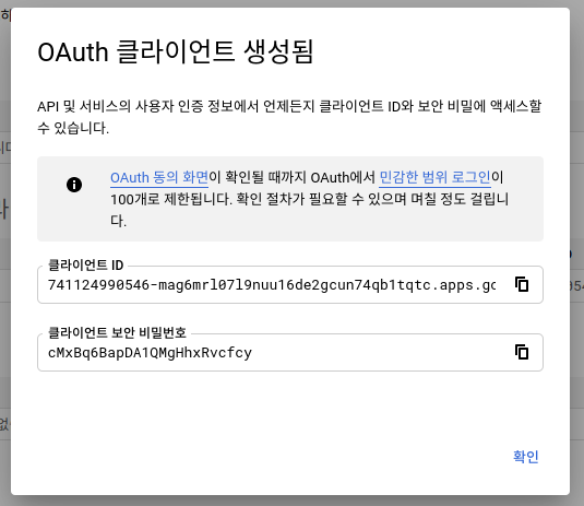 OAuth 클라이언트가 생성되면 클라이언트 ID 와 클라이언트 보안 비밀번호를 얻을 수 있다.