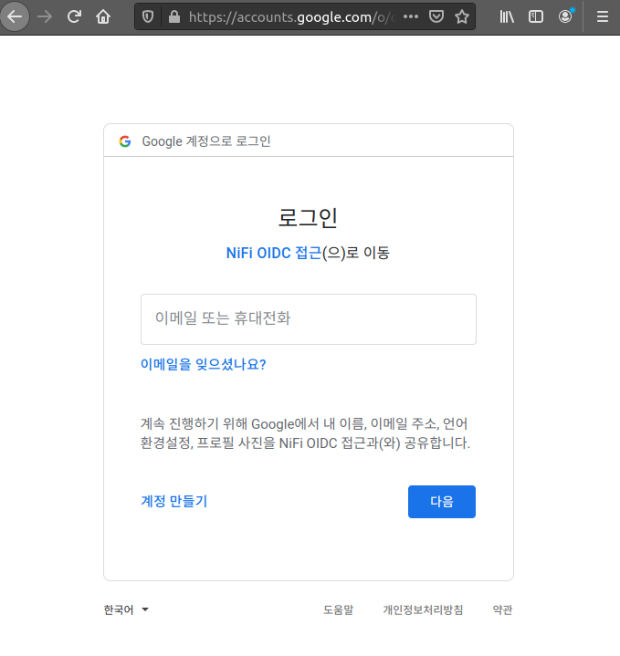 여기서 앱 이름은, NiFi 에 접근하는 사용자들이 google login 하는 창에서 볼 수 있는 이름이다.