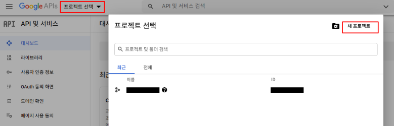 프로젝트 선택을 누르고, 새 프로젝트를 누른다.