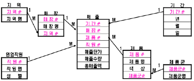 - 스타 스키마의 모든 dimension 테이블을 정규화한 스키마