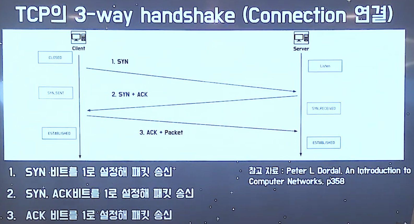 이에 대한 응답으로 ACK 에 비트 1을 줌 "클라이언트야 너의 연결 요청을 잘 받았어"