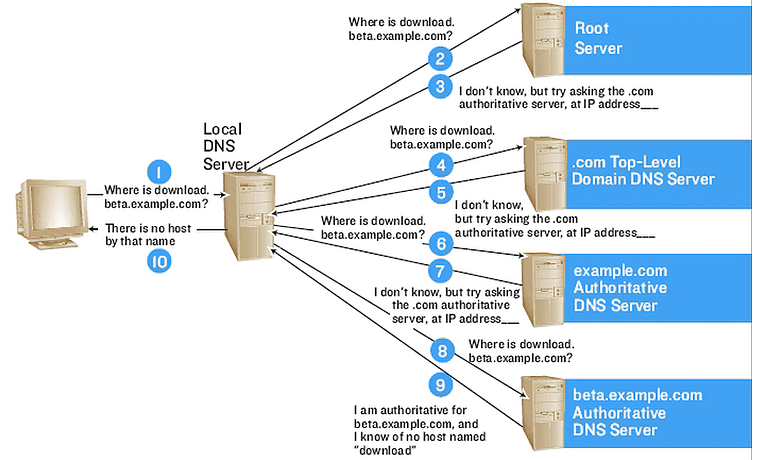 사용자의 "download.beta.example.com 을 ip 로 변환해달라는 요청"이 Local DNS Server 로 전달됨