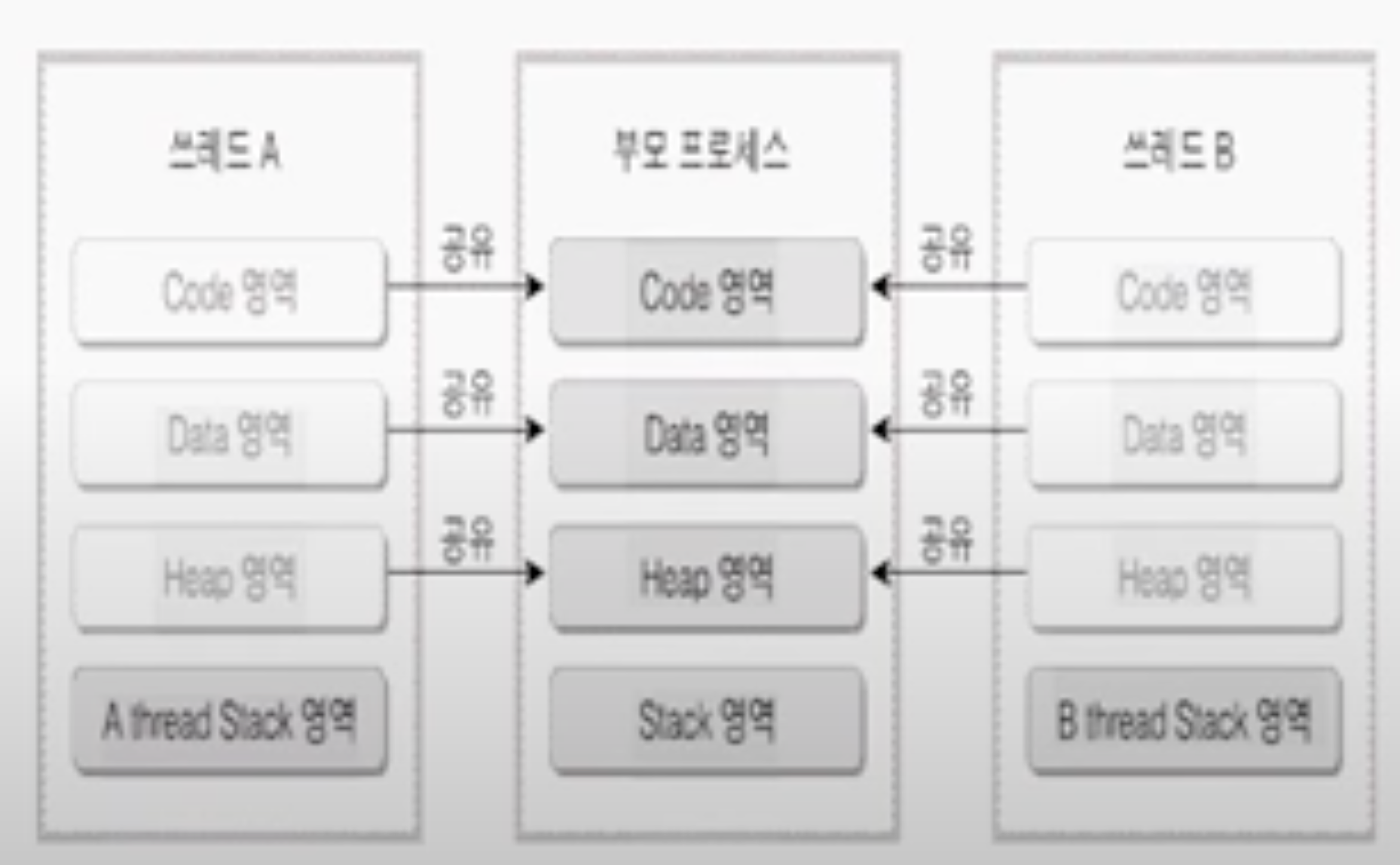 쓰레드들은 프로세스의 Code, Data, Heap 영역은 공유함
