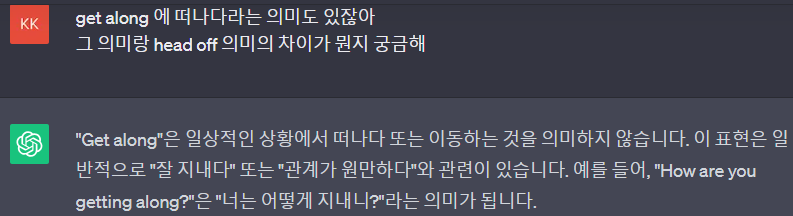 그리고 ChatCPT 는 get along 에 '떠나다'라는 의미가 없다고 큰 소리를 쳤다....