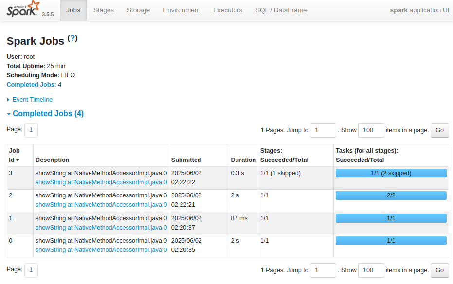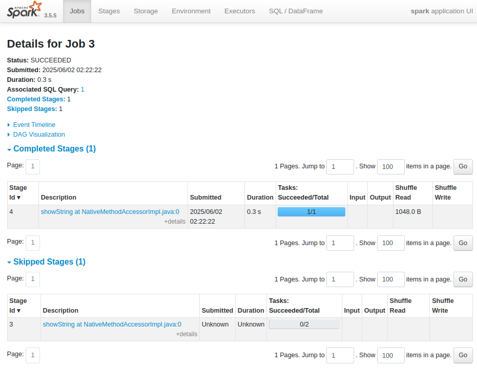 | Stages: Succeeded/Total : 해당 Job을 구성하는 Stage들의 성공한 수와 전체 수 괄호 안의 (skipped)는 해당 Stage가 이미 이전 Job에서 성공적으로 완료되어, 다시 실행되지 않고 건너뛰어진 경우를 나타냄 |