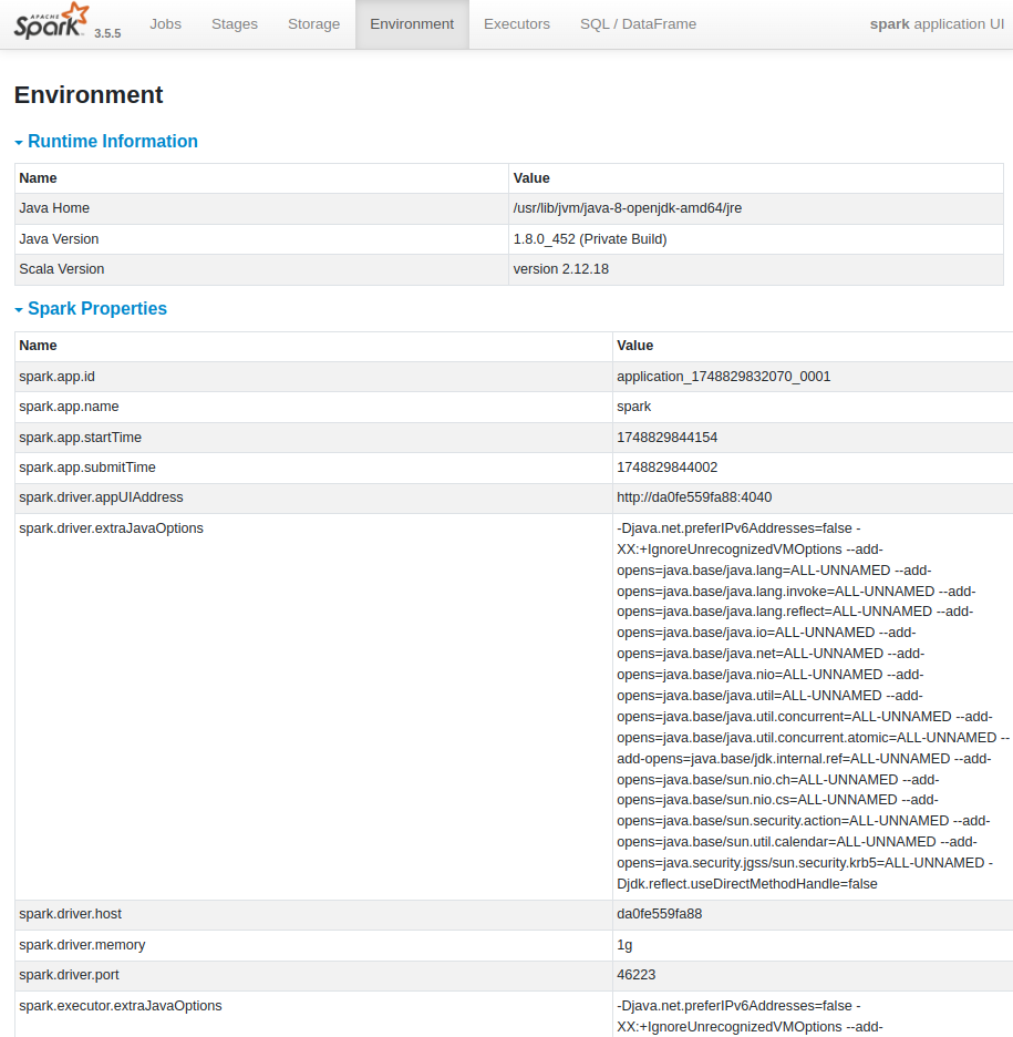 | Environment : Spark Application이 실행되는 환경에 대한 다양한 설정 정보를 보여줌 JVM 설정, Spark 속성, 시스템 속성, 클래스패스 정보 등 확인 가능 |