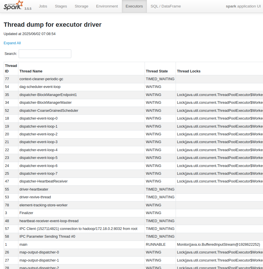 | Thread Dump : 각 Executor JVM의 현재 스레드 상태 스냅샷 (프로세스 내에서 병렬처리를 위해 동작하는 그 스레드 맞음) Executor 내에서 어떤 스레드가 실행 중인지, 각 스레드의 상태 (RUNNABLE, BLOCKED, WAITING 등), 스택 트레이스 등 확인 가능 특정 Executor가 응답하지 않거나 (hang), CPU 사용률이 비정상적으로 높거나, 데드락이 의심될 때 확인하는 부분 - Hang 분석 : 스레드 덤프를 통해 특정 스레드가 어떤 상태로 멈춰 있는지 (예: 특정 리소스에 BLOCKED 상태로 오랫동안 대기 중인지) 파악하여 hang의 원인을 진단할 수 있음 어떤 쓰레드가 오랜 시간동안 BLOCKED, WAITING 상태라면 혹시 이게 hang의 원인이지 않을까 의심해볼 수 있지. 어떤 락을 기다리고 있는지, 어떤 스레드가 깨워주기를 기다리는지 등을 파악하여 데드락이나 장기 지연 문제를 진단할 수 있음 - CPU 병목 분석 : CPU를 많이 사용하는 스레드의 스택 트레이스를 분석하여 어떤 코드가 CPU를 집중적으로 사용하고 있는지 확인하고, 성능 개선의 힌트를 얻을 수 있음. 특정 스레드가 과도한 CPU를 사용하는지 분석 가능! - 데드락 감지 : 여러 스레드가 서로 다른 리소스를 점유하고 놓지 않아 영원히 대기하는 데드락 상황을 스레드 덤프를 통해 감지 - Executor 내부 상태 파악: Executor가 현재 어떤 작업을 수행하고 있는지, 어떤 라이브러리 함수를 호출하고 있는지 등을 스택 트레이스를 통해 자세히 확인 가능. 스레드가 특정 자원 (락, I/O 완료 등)을 기다리는 상황을 파악하여 자원 경쟁을 줄이거나 비효율적인 자원 사용 패턴을 개선 |