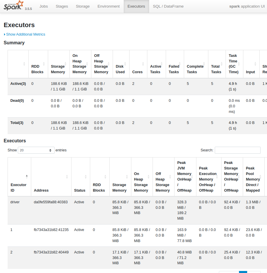 | Executors : Spark Application에 할당된 Executor들의 상태 및 리소스 사용 정보를 보여줌 각 Executor의 ID, 호스트, 활성/완료된 Task 수, CPU 사용률, 메모리 사용량 등 확인 가능 |