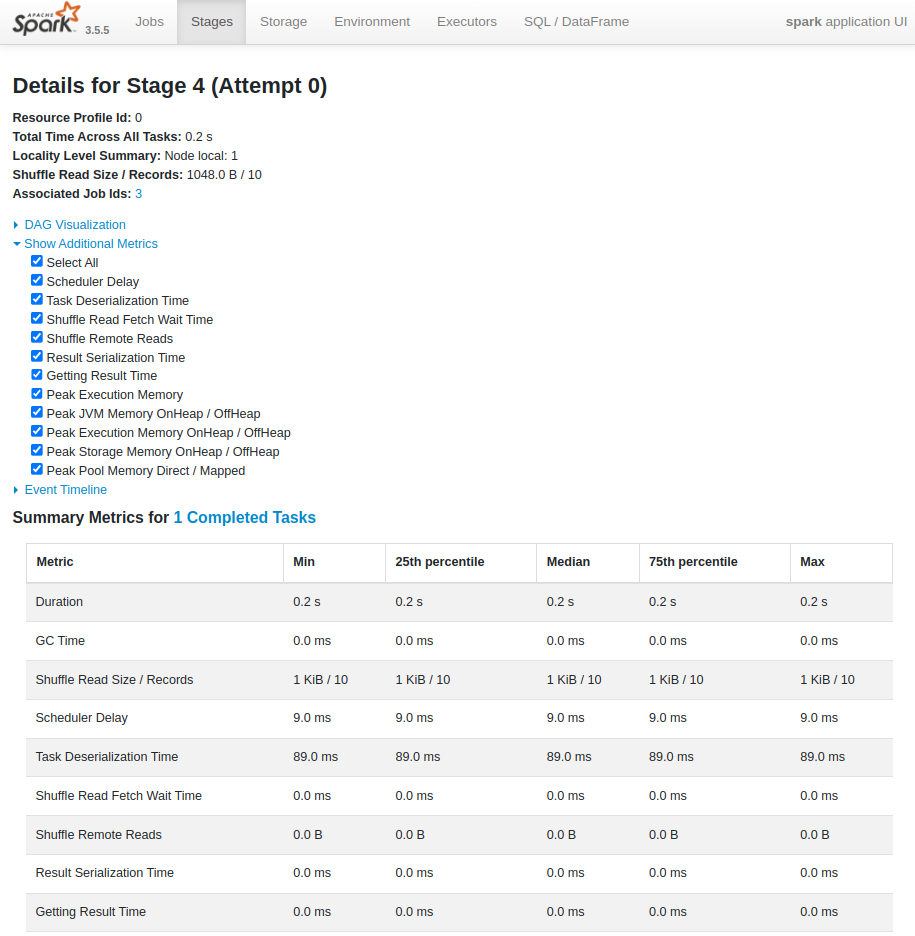 | Max (Maximum) : 완료된 Task들 중에서 해당 메트릭의 최댓값 예를 들어, 'Peak Execution Memory'의 Max 값이 32.1 MiB라면, 완료된 Task 중 가장 많은 메모리를 사용한 Task의 최대 실행 메모리가 32.1 MiB라는 의미 |