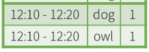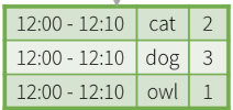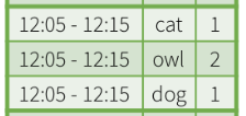 window 12:05 ~ 12:15 동안 쌓인 데이터들(12:07, 12:11, 12:13) 로 word count 를 한 결과 테이블이다.